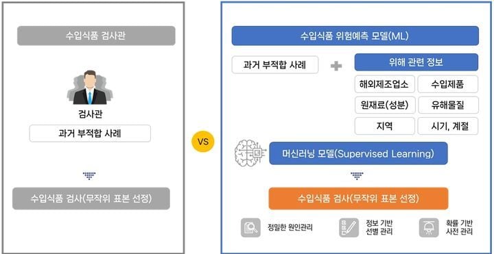 식약처가 선보인 'AI 위험예측 모델'은 농산가공식품류(전분·밀가루·견과류 등)와 수산가공식품류(어육·젓갈·건포·조미김 등)를 대상으로 개발됐다. 이 모델은 축적된 부적합 이력, 원재료, 통관 정보는 물론 해외 기상·수질 자료, 식중독·리콜 현황 등 방대한 빅데이터를 AI로 학습해, 통관단계에서 부적합 가능성이 높은 식품을 자동으로 선별한다. 기존에는 표본추출 방식의 무작위검사에 의존해 왔으나, AI 도입으로 검사 대상을 위험도 기반으로 정밀하게 도출할 수 있게 됐다.