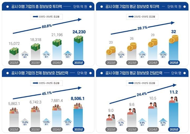 공시 이력이 축적된 기업들을 따로 보면 투자 확대 속도는 더 가팔랐다. 2022년 정보보호 공시제도 의무화 이후 4년 연속 공시에 참여한 559개사를 분석한 결과, 평균 정보보호 투자액과 전담인력은 2022년 대비 각각 48.3퍼센트, 36.6퍼센트 증가했다. 공시를 통해 매년 내부 보안 수준을 점검하고 외부에 공개하는 과정이 중장기적인 투자 확대와 인력 보강으로 이어지고 있다는 해석이 나온다.