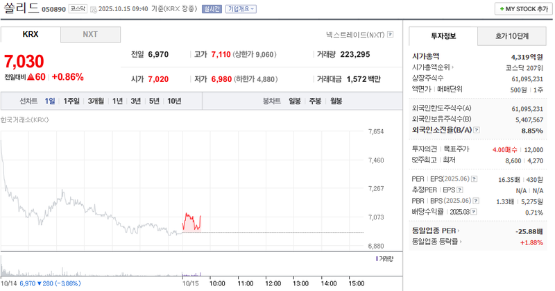 통신장비 등 ICT 기업 쏠리드가 10월 15일 장 초반 비교적 조용한 상승세로 출발했다. 같은 업종 내 주가 전반이 강세를 보이는 가운데, 쏠리드 주가는 이날 오전 9시 40분 기준 7,030원에 거래되고 있다. 이는 전장 대비 60원 오른 수치로, 0.86%의 주가 상승률을 보였다.