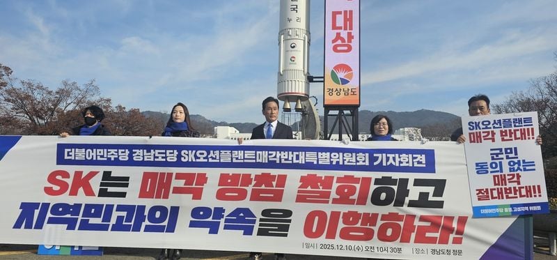 더불어민주당 경남도당 SK오션플랜트매각반대특별위원회는 10일 경상남도청 정문 앞에서 기자회견을 열고 SK오션플랜트의 사모펀드 매각 추진 중단을 촉구했다. 특위는 경남 해상풍력 산업의 핵심 거점을 민간 매각 대상으로 내세운 SK그룹을 강하게 비판하며 지역사회와 정치권의 공동 대응을 요구했다.