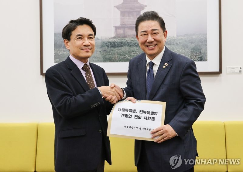 강원특별자치도와 전라북도는 이날 국회 지연에 대한 항의의 뜻을 담은 공동 서한을 마련해 여야 원내대표에게 전달했다. 김 지사는 서울 국회를 찾아 더불어민주당 김병기 원내대표와 국민의힘 송언석 원내대표를 각각 면담하고 서한을 직접 건넸다.