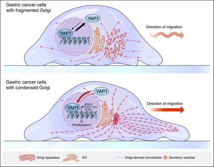 골지체의 구조적 변화가 위암의 악성화를 촉진하는 핵심 경로임이 국내 연구진에 의해 세계 최초로 밝혀졌다. 위암 세포에서 ‘세포의 우체국’으로 불리는 골지체가 뭉쳐 응축되면 미세소관이 더욱 활발하게 형성되고, 이 도로망을 타고 암 촉진 단백질 YAP1이 신속히 세포핵으로 들어가 암의 성장과 전이를 가속화한다는 새로운 메커니즘이 제시된 것이다. 업계는 이번 연구 성과를 ‘세포소기관 구조 조절’이라는 새로운 항암 패러다임 전환의 분기점으로 평가하고 있다.