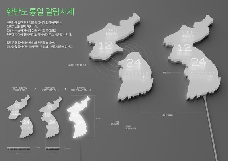디자인 부문 대상은 박진영 씨가 출품한 한반도 통일 알람 시계가 차지했다. 남한과 북한 지도 형태의 시계 두 개를 온전한 한반도 모양으로 맞춰야만 알람이 멈추도록 설계됐고, LED 조명 기능을 더해 시각적 상징성을 강조했다. 통일돼야 고요해진다는 메시지를 일상 소품에 녹여낸 점이 높은 평가를 받은 것으로 전해졌다.