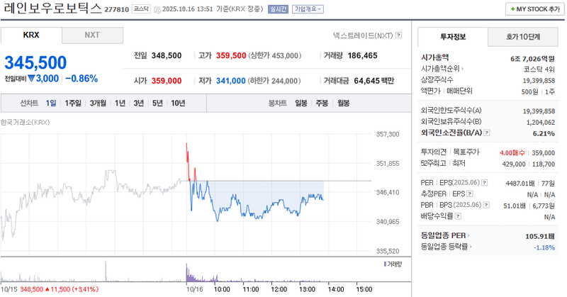 레인보우로보틱스 주가가 10월 16일 장중 345,500원을 기록하며 전 거래일 대비 0.86% 하락했다. 네이버페이 증권에 따르면 이날 오후 1시 51분 현재 레인보우로보틱스의 주가는 기준가 348,500원보다 3,000원 내린 345,500원에 거래되며 약세를 보였다. 시가는 359,000원, 고가는 359,500원, 저가는 341,000원으로, 당일 주가 변동폭은 18,500원을 나타냈다. 거래량은 186,465주, 거래대금은 646억 4,500만 원에 달했다.
