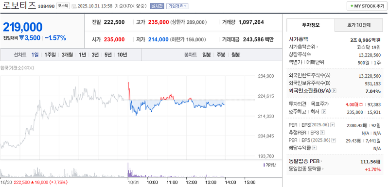 로보티즈 주가가 10월 31일 장중 1.57% 하락하며 219,000원에 거래를 마감했다. 네이버페이 증권에 따르면 이날 오후 1시 58분 기준, 로보티즈는 전 거래일 종가(222,500원) 대비 3,500원 내렸다. 장 초반 235,000원으로 시작한 주가는 214,000원까지 저점을 기록한 뒤, 고점 235,000원 사이에서 등락을 반복했다. 장중 변동폭은 21,000원에 달했다.