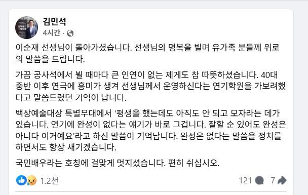김민석 국무총리는 25일 페이스북에 글을 올려 현역 최고령 배우로 활동해 온 이순재의 별세에 깊은 애도를 전했다. 김 총리는 글에서 "선생님의 명복을 빌며 유가족분들께 위로의 말씀을 드린다"고 적어 유족에게 위로의 뜻을 전했다.