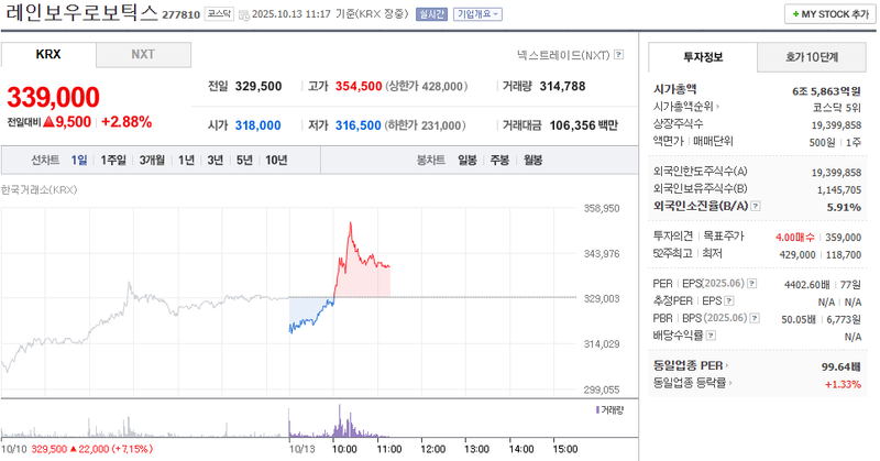 산업용 로봇 기업 레인보우로보틱스가 10월 13일 코스닥 시장에서 강한 상승세를 나타냈다. 오전 11시 18분 기준 네이버페이 증권에 따르면 레인보우로보틱스는 전 거래일 대비 9,500원(2.88%) 오른 339,000원에 거래됐다. 동시간대 동일업종 평균 등락률인 1.33%를 크게 상회한 수치로, 투자자들의 관심이 집중됐다.