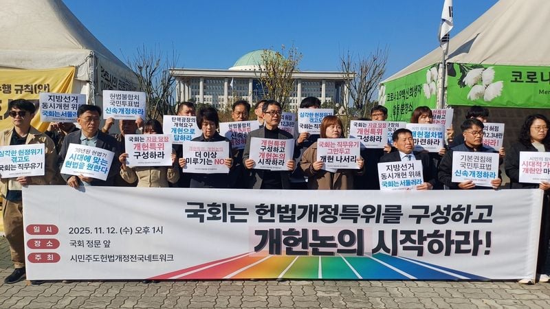 이날 시민주도 헌법개정 전국네트워크는 "이재명 정부가 국정과제 123건을 확정하며 1호 과제로 개헌을 선정한 지 2개월이 지났다"며, "아직 국회에서는 개헌에 대한 본격적인 논의조차 이뤄지지 않고 있다"고 지적했다. 또 "국회가 공언한 대로 내년 지방선거에서 일차적으로 개헌이 이뤄지려면, 지금 당장이라도 개헌특위를 구성해 논의를 시작하고 위헌적인 국민투표법을 개정해야 한다"고 강조했다.
