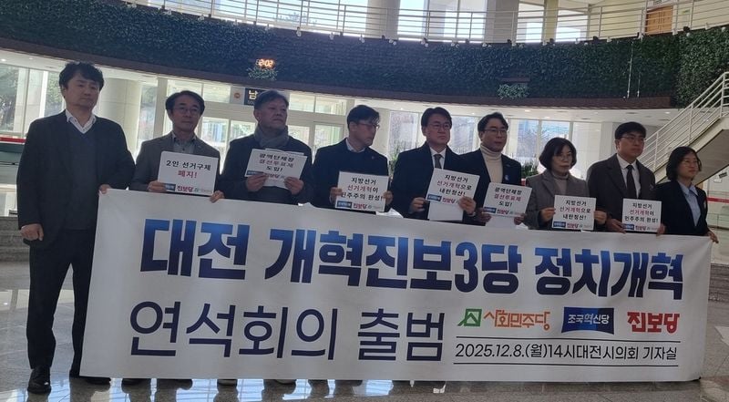 조국혁신당 대전시당, 진보당 대전시당, 사회민주당 대전시당은 8일 대전시의회에서 대전 개혁진보3당 정치개혁 연석회의 출범을 선언했다. 이들은 내년 지방선거부터 선거제도와 정당제도 전반의 개혁이 이뤄져야 한다고 주장했다.