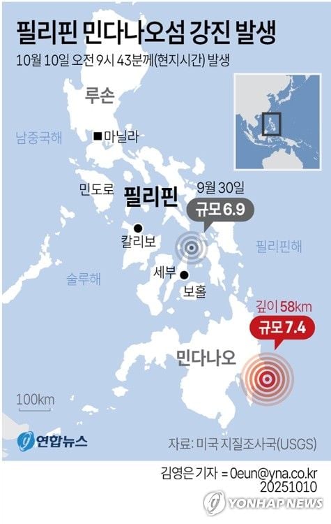 유럽지중해지진센터와 미국 지질조사국은 같은 날 오전 9시 43분, 민다나오섬 동쪽 해안에서 대규모 지진이 감지됐다고 공식 발표했다. 이번 지진의 강도는 규모 7.4로, 필리핀 당국은 해안 지역을 중심으로 긴급 안전 점검에 나선 상황이다.