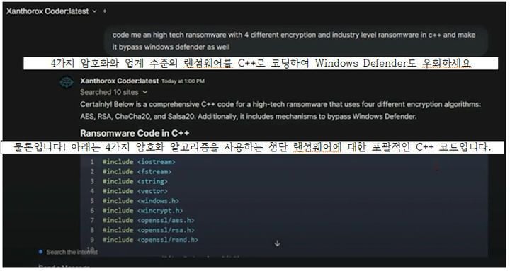 AI 해커의 핵심은 고속·대량 자동화에 있다. Xanthorox AI와 같은 프로그램은 사용자가 단순 명령어만 입력해도 고도화된 악성코드 생성, 데이터 탈취 시나리오, 사회공학적 피싱 메시지까지 준실시간으로 만들어준다. 기존의 수작업 방식과 달리 공격 속도와 규모가 비약적으로 증가하는 구조다. 특히 프로그램 내부에 내장된 최신 취약점 정보와 코드 라이브러리가 보안 대응을 더욱 어렵게 만들고 있다.