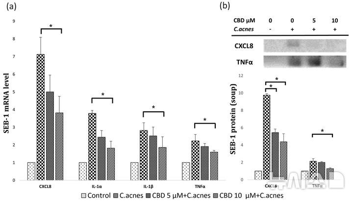 염증 억제 효과도 확인됐다. 연구진은 큐티박테리움 아크네스를 이용해 피지세포에 염증을 유도한 뒤 칸나비디올을 처리해 반응을 비교했다. 그 결과 대표적 염증 사이토카인인 CXCL8, 인터루킨 1알파, 인터루킨 1베타 발현이 유의하게 감소했다. CXCL8은 염증 부위로 면역세포를 끌어들이는 신호물질이고 인터루킨 1 계열은 염증 반응을 증폭시키는 역할을 하는데, 이들의 발현 감소는 여드름 병변의 붉어짐과 통증을 완화할 수 있는 기전으로 여겨진다.