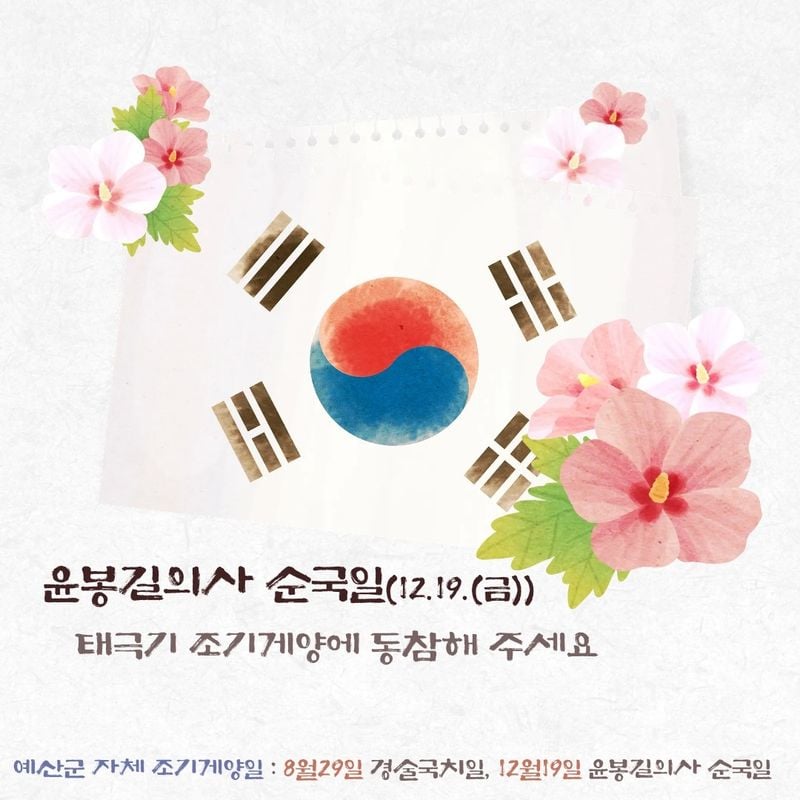 예산군은 올해 국기 게양·관리 및 선양에 관한 조례를 개정해 8월 29일 경술국치일과 12월 19일 윤봉길 의사 순국일을 자체 조기 게양일로 새로 지정했다. 법정 기념일과 별개로 지역 역사와 직결된 날을 군 차원의 공식 추모일로 삼은 셈이다.