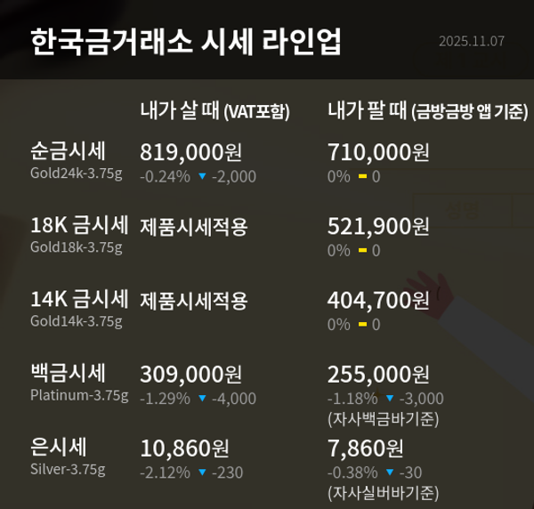금·백금·은 등 주요 귀금속 시세가 11월 7일 기준으로 일제히 하락하며 가격 조정 국면에 진입했다. 안전자산으로 꼽히는 금도 일시적 조정을 보이며 금속시장 전반에 변동성이 커지는 모습이다.