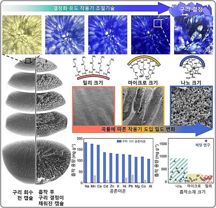 핵심은 구리 이온이 2차원 표면에 붙는 수준을 넘어 캡슐 내부에서 3차원 결정으로 자라나도록 유도한 설계다. 연구팀은 구리 이온이 표면에서 핵을 형성한 뒤 입체적으로 성장하는 과정을 기초 연구를 통해 규명하고, 이 성장 메커니즘을 최대한 활용할 수 있도록 내부 구조를 재구성했다. 특히 이번 기술은 기존 흡착제가 표면에만 금속을 붙여 한계 용량이 빠르게 포화되던 문제를 정면으로 공략했다는 점에서 의미가 크다.