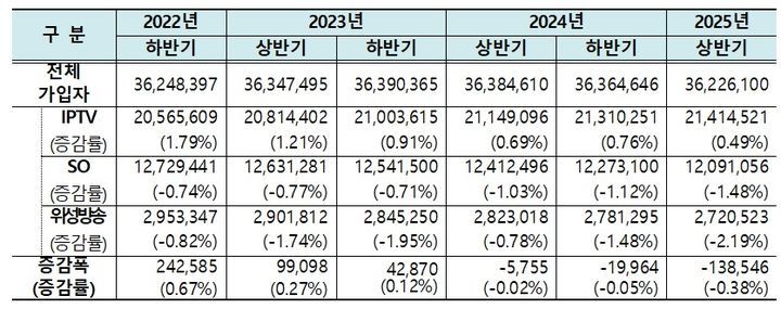 방송미디어통신위원회는 24일 2025년도 상반기 유료방송 가입자 수와 시장점유율을 확정해 발표했다. 조사 결과 IPTV, 종합유선방송, 위성방송을 합친 전체 유료방송 가입자는 3622만6100명으로 집계됐다. 작년 하반기 3636만4646명과 비교해 13만8546명 줄어든 수치다. 유료방송 가입자 규모는 2024년 상반기 처음 감소한 이후 하락 흐름이 이어지고 있는 것으로 분석된다.