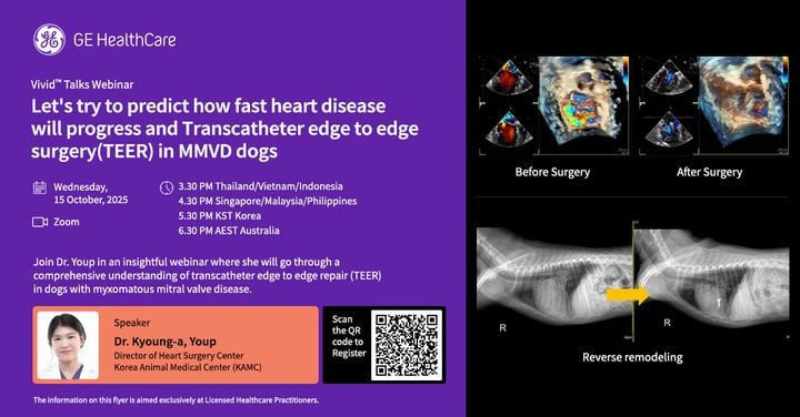 MMVD는 좌심방·좌심실 사이 판막 변성으로 인해 혈액 역류가 발생하는 심장병으로, 고령화 반려동물 시장에서는 조기 진단·초기 치료가 임상 결과에서 큰 차이를 만들 수 있다. 엽경아 고려동물메디컬센터 센터장은 국내 수의 분야에서 TEER를 직접 도입해 다수의 성공적 케이스를 만들어온 임상 경험을 기반으로, 초음파와 시술 통합 솔루션의 적용 노하우를 발표한다.