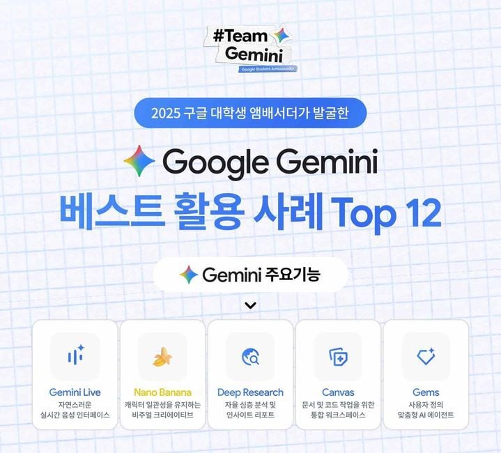 구글은 9일 구글 대학생 앰배서더가 직접 발굴한 대학생을 위한 구글 제미나이 베스트 활용 사례 톱 12를 공개했다. 동시에 그간 프로그램에 참여해 온 앰배서더 대상 수료식도 열어 활동을 마무리했다. 이번에 선정된 12개 활용법은 전국 34개 대학교와 동아리에서 활동한 340여 명의 앰배서더가 제미나이 사용법을 전파하는 과정에서 모은 125개 사례 가운데 실용성과 참신성을 기준으로 추려낸 결과다. 활용 분야는 대학생의 주요 관심사에 맞춰 학업, 진로, 일상, 취미 등 4개 카테고리로 정리됐다.