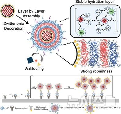 연구팀은 ‘양자점 복합체’라는 신규 형태의 나노입자를 자체 개발해 기존 방식보다 현저하게 빠르고 민감한 검출을 가능하게 만들었다. 양자점(Quantum Dot)은 수 나노미터 크기의 반도체 입자로, 입자 표면에 빛을 쏘면 특정 색으로 발광해 극미량의 바이오마커(항원, 단백질 등)를 판별할 수 있다. 특히 이번 복합체는 여러 개의 양자점을 하나의 견고한 나노구조에 통합, 신호 세기와 안정성을 기존 대비 대폭 높인 것이 특징이다. 연구팀은 층상 자기 조립 공정이라는 독창적 공법을 통해 나노입자 표면의 화학 구조를 정밀 조절했으며, 외부 영향에 따른 발광 신호 약화(형광 소광)도 최소화했다. 이를 통해 항원·항체 결합력 역시 최대화할 수 있었던 것으로 분석된다.