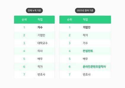 개인의 성향을 보여주는 비정형 정보 중 하나로 MBTI 입력 항목도 제공한다. 올해 집계에서 ENFJ, ENFP, ENTJ 유형이 가장 높은 비중을 차지했으며, 이 유형은 특히 가수, 기업인, 온라인콘텐츠창작자 직업군에 많이 분포하는 것으로 나타났다. MBTI는 과학적 타당성 논란이 있는 지표이지만, 대중적 인지도와 소통 도구로서의 효용을 감안해 인물 정보에 반영된 형태다. 향후 성향 데이터가 크리에이터·광고 매칭, 팬덤 분석 등과 연계될 여지도 있어, 데이터 활용 범위를 둘러싼 논의도 뒤따를 수 있다.