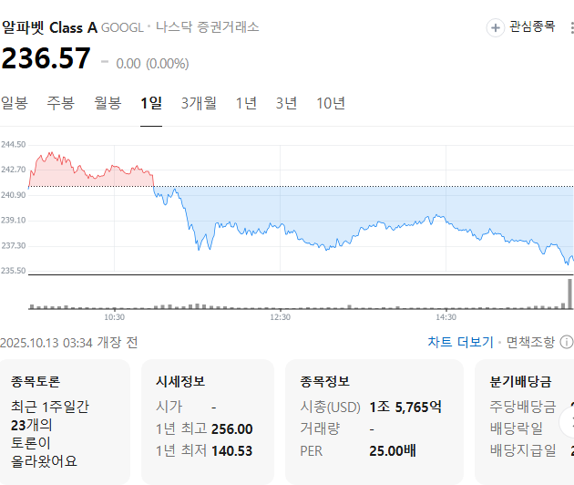 미국 기술주의 대표주자인 구글(알파벳 Class A) 주가가 236.57달러로 지난 거래일 대비 -1.95% 하락하며 고점에서 숨고르기에 들어갔다. 네이버페이 증권에 따르면 11일(미국 동부 기준 10일) 알파벳 Class A는 변동성 확대 속 약세로 마감해 시장의 이목을 집중시켰다. 시가, 고가, 저가, 거래량 등은 공개되지 않았으나, 52주 최저치(140.53달러) 대비 여전히 견고한 흐름이 이어져 왔다. 최근 52주 최고치인 256.00달러에 가까운 수준을 유지 중이다. 이와 함께 구글의 시가총액은 1조 5,765억 달러(한화 약 2,251조 879억 원)로 글로벌 기술기업 중에서도 선두권을 유지하고 있다.