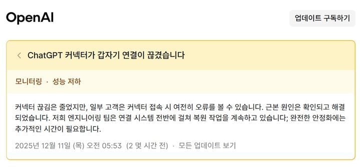오픈AI는 11일 오전 자사 시스템 상태페이지를 통해 안드로이드 기기 일부에서 챗GPT 접속 오류가 발생했다고 공지했다. 회사 측은 문제 발생 사실을 확인했다고 밝히며, 안드로이드 환경에서 서비스에 연결되지 않거나 응답이 지연되는 현상이 관찰되고 있다고 설명한 것으로 전해졌다.