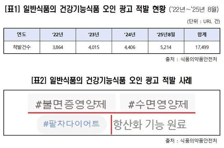 식품의약품안전처와 국회 보건복지위원회 소속 남인순 더불어민주당 의원실 자료에 따르면, 2022년부터 2024년까지 1만7499건에 달하는 건강기능식품 오인 광고가 적발된 것으로 집계됐다. 특히 올해 적발 건수는 4406건을 기록해, 2022년 3864건 대비 약 35% 늘었다. 건강기능식품 부당 광고 역시 최근 5년 만에 2만2948건에 달해, 산업 규모 확대와 동시에 광고 규제 미비도 드러났다.