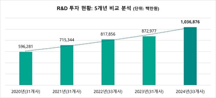 한국글로벌의약산업협회(KRPIA)가 30일 발표한 ‘2025년 KRPIA 연구개발 및 투자현황 보고서’에 따르면, 작년 국내 진출 33곳 글로벌 제약사의 임상연구 투자 규모는 1조369억원으로 집계됐다. 이는 전년 대비 18.8% 늘어난 수치로, 최근 5년간 연평균 14.8% 성장을 이어온 것으로 나타났다. R&D 투자 중 임상 단계 의약품 개발 비용이 전체의 42.9%에 해당하는 4452억원으로 가장 큰 비중을 차지했다.