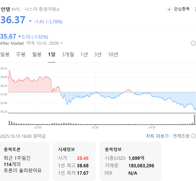 이번 인텔의 주가 하락은 이날 시가 38.46달러에서 시작해 장중 39.65달러까지 올랐다가, 저가 36.30달러까지 내려가는 등 극심한 변동성을 보인 끝에 이뤄졌다. 총 거래량은 1억 8,306만여 주, 거래 대금은 약 68억8,000만 달러로 집계됐다. 인텔의 시가총액은 1,699억 달러, 한화로 약 242조 4,884억 원 수준이다. 지난 52주 동안 최고가는 38.68달러, 최저가는 17.67달러로, 최근 들어 가격대가 다소 폭넓게 움직이는 추세다.