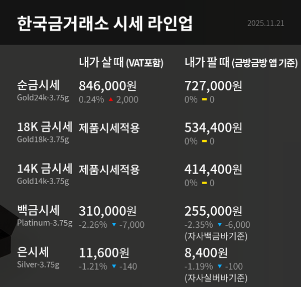 한국금거래소가 2025년 11월 21일 오전 11시 16분 기준으로 집계한 시세에 따르면 24K 금(3.75g 기준)을 살 때 가격은 846,000원으로 전일보다 2,000원, 비율로는 0.24% 상승했다. 같은 기준 팔 때 가격은 727,000원으로 전일과 동일하게 유지됐다. 최근 국제 금시세 변동성이 줄어든 가운데 국내 실물 금 가격도 전반적으로 안정 흐름을 보이고 있다는 평가가 나온다.