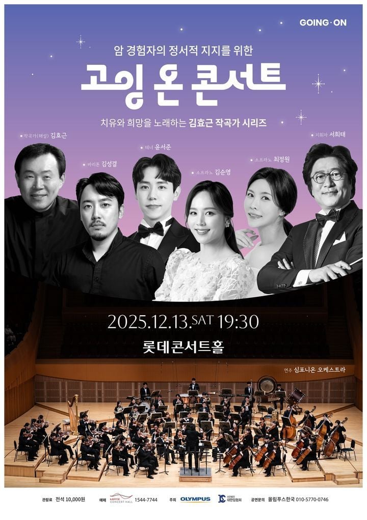 행사는 올림푸스한국의 ‘고잉 온(Going-on) 캠페인’ 일환으로 매년 열리고 있다. 암 경험자가 음악을 통해 자신의 이야기를 나누고, 가족 및 지역사회와의 정서적 유대를 강화하도록 설계됐다. 특히 올해는 설암을 극복한 서희태 지휘자가 심포니온 오케스트라를 지휘하고, 김효근 작곡가가 직접 무대 해설을 맡는다. 소프라노 김순영, 테너 윤서준 등 정상급 성악가들이 참여해, 사랑·회복·생명·희망을 주제로 공연한다. 암에서 회복한 예술인이 앞장서 공연을 이끄는 방식이 기존 음악회와의 차별점으로 꼽힌다.