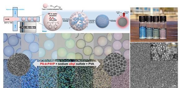 연구팀은 선형 블록공중합체를 활용, 입자 내부에 수백 나노미터 크기 구멍들이 3차원적으로 배열된 ‘역오팔 구조’의 고분자 미세입자를 합성하는 데 성공했다. 이는 기존 오팔 내부의 실리카 구슬 구조와 반대되는 원리로, 외부에서 볼 때 단일하고 선명한 색을 각도에 상관없이 구현할 수 있다. 학계에서 고분자 입자 내부에 수백 배 작은 나노 구멍을 정교하게 배열하는 것은 난제로 꼽혔으나, 연구팀은 계면과학 원리를 접목시켜 이를 해결했다. 즉, 분산 공정에서 유기 용매 증발 과정의 ‘계면 불안정화’를 이용해 물방울을 내부로 침투시키고, 증발 뒤 나노 공극으로 유지시키는 혁신적 기술이다.