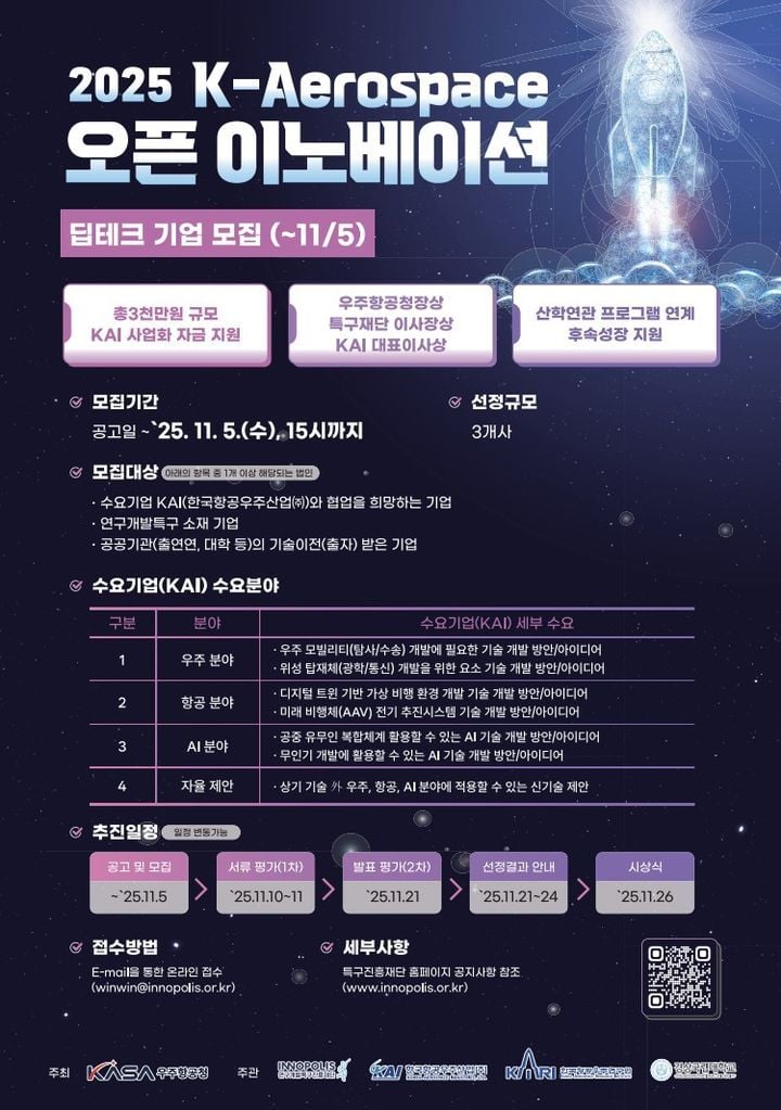 우주·항공·인공지능(AI) 기술이 국내 딥테크 산업의 혁신 경쟁을 촉진하고 있다. 우주항공청은 13일, 한국항공우주산업(KAI)과 연구개발특구진흥재단, 진주강소특구(경상대), 한국항공우주연구원 등과 함께 ‘2025 K-항공우주산업 오픈 이노베이션’을 출범한다고 밝혔다. 신생 스타트업부터 중견기업까지 ‘차세대 우주항공 딥테크’가 요구되는 가운데, 민·관·학이 집결해 산업 파트너십·기술 상용화 지원 패러다임을 새롭게 구축한다. 업계는 공공 중심의 R&D 지원에서 실수요 기업 중심 협업으로의 변화가 ‘한국형 항공우주 혁신 경쟁의 촉매’가 될 수 있을지 주목하고 있다.